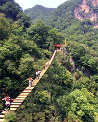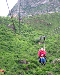 2018年,新增了由新鄉(xiāng)市新世紀(jì)體育游樂有限公司搭建的全長325米、距離地面高差約100米的高空飛索體驗項目,是朝天吼景區(qū)的一項高山挑戰(zhàn)力作,穿越云海、遙看山川,驚險刺激。飛索采用無動力型直滑式單承載式飛索,設(shè)立上站和下站,滑索上、下站兩端用特種鋼芯鋼絲繩連接,形成架空軌道,依靠兩端的高差,滑具載客后,靠自身重力下滑至著陸平臺,在體驗驚險刺激的同時可將景區(qū)美景360度盡收眼底。飛索運動充滿速度感和刺激性,朝天吼景區(qū)成功突破了接待瓶頸,讓游客可以輕松跨越山谷、河流、湖面等障礙,體會到凌空飛渡的新奇感受,因此深得游客喜愛。